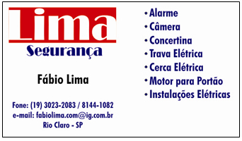 A LIMA SEGURANÇA possui mão de obra qualificada para instalação de Alarme, Cerca Elétrica, Câmera de Segurança, Instalações Elétricas, Motor p/ Portão e Trava de Segurança (Cadeado Eletrônico) para Portão Basculante. Invista em sua segurança e na segurança de sua família. Ligue para 19-3023-2083 - 19-8144-1082. São mais de 6 Anos atendendo com qualidade Rio Claro e Região.