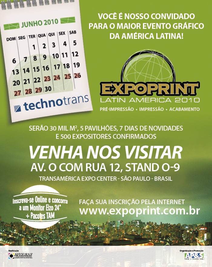 technotrans na Expoprint 2010 STAND O9 Rua 12 com Avenida O technotrans América Latina estará presente no maior encontro latino-americano de tecnologia gráfica, apresentando toda sua linha de produtos. São sistemas de circulação, preparação, refrigeração e controle de temperatura da solução de molha (contínua) • sistemas de controle de temperatura da tinta • sistemas de filtração da solução de molha • sistemas automáticos de alimentação de tinta (offset rotativa e plana) • sistemas de circulação de verniz • sistemas de tratamento e preparação de água para impressão • sistemas automáticos de lavagem de blanquetas • sistemas de umidificação por pulverização (spray dampening). Acessórios originais de fábrica, desenvolvidos e produzidos com a alta tecnologia da technotrans AG, com sede na Alemanha e equipando as principais marcas mundiais de impressoras, como Heidelberg, manroland, Komori, KBA, GOSS, Ryobi etc. "Por isso, a presença da technotrans na Expoprint 2010 é tão aguardada, quer por sua importância como geradora de resultados positivos aos seus clientes, quer por sua garantia e segurança em oferecer mão de obra e peças de reposição originais de fábrica.Somente a technotrans podeoferecer serviços de qualidade, com um padrão de excelência reconhecido internacionalmente. Isso porque, a tecnologia dos equipamentos que estão nas principais marcas mundiais de impressoras foi desenvolvida pela própria technotrans, além do treinamento de toda equipe ser realizada na própria fábrica", afirma Wallat.